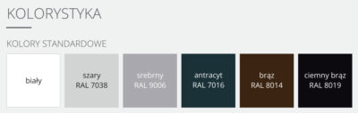 Osłona MINI 77 dostępna jest w 6 kolorach podstawowych . Istnieje również możliwość zamówienia poszczególnych elementów osłony, czyli skrzynki, pancerza oraz prowadnic w różnych kolorach, dzięki czemu możemy dopasować jej wygląd do szczególnych wymagań.